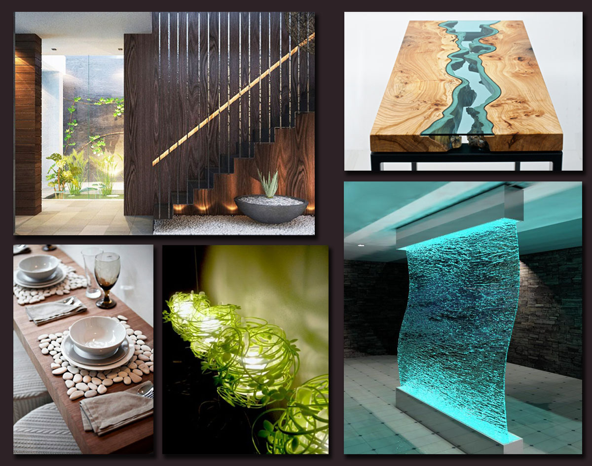 Υλικά όπως η πέτρα και το ξύλο έχουν άμεσες αναφορές στο φυσικό τοπίο, αλλά και μια γαλάζια γυάλινη επιφάνεια μας δίνει συχνά την αίσθηση του νερού, αν προσθέσουμε και κάποια φυτικά μοτίβα και χρώματα, νιώθουμε αμέσως την οικεία αίσθηση της φύσης, ακόμη και σε ένα διαμέρισμα πολυκατοικίας.
